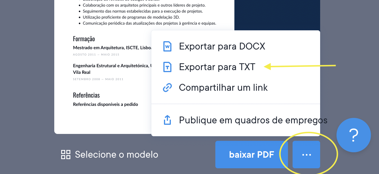Se estiver no plano gratuito, pode exportar o seu currículo no formato TXT ou partilhar ligações online para o seu currículo.
