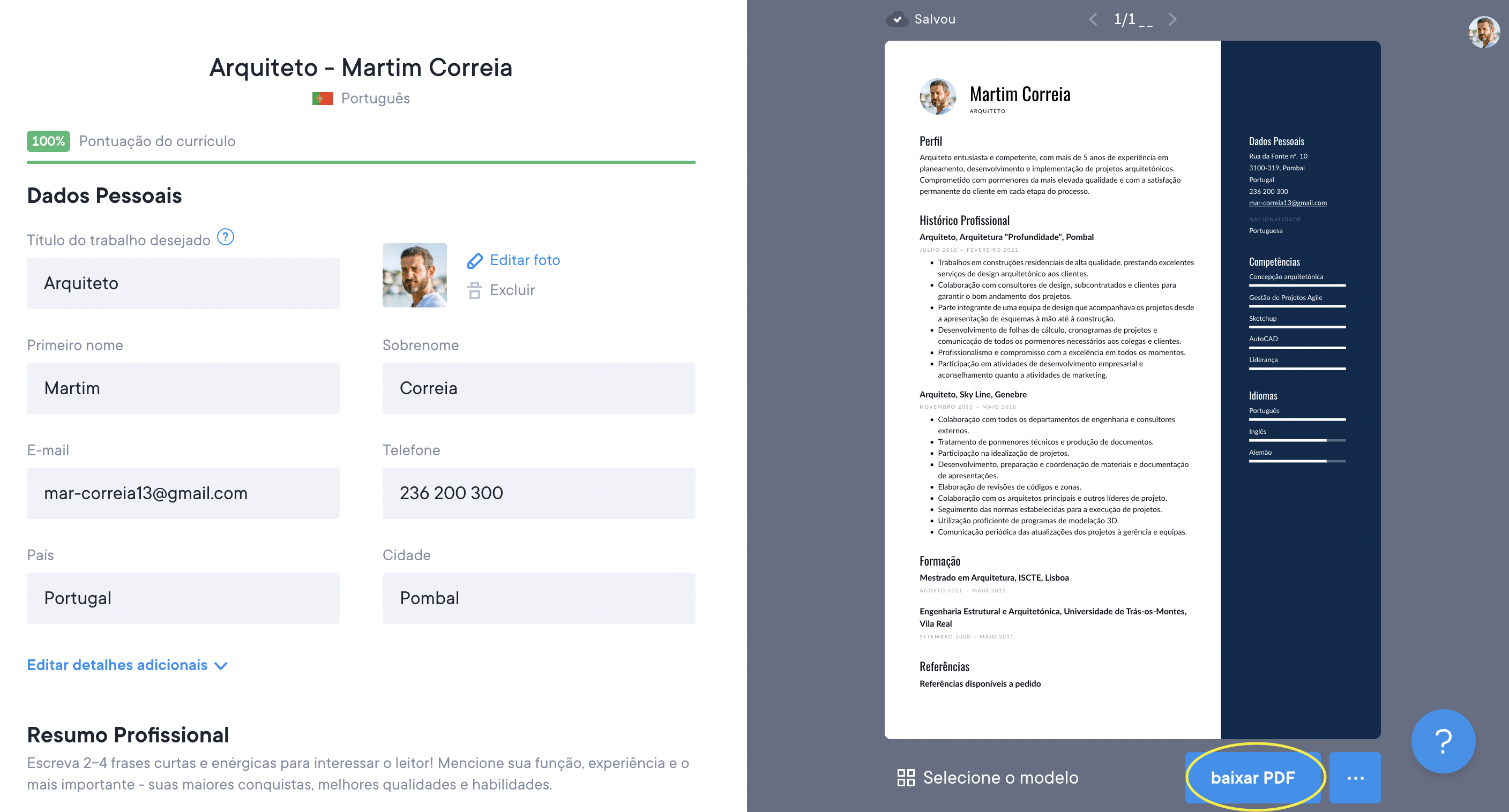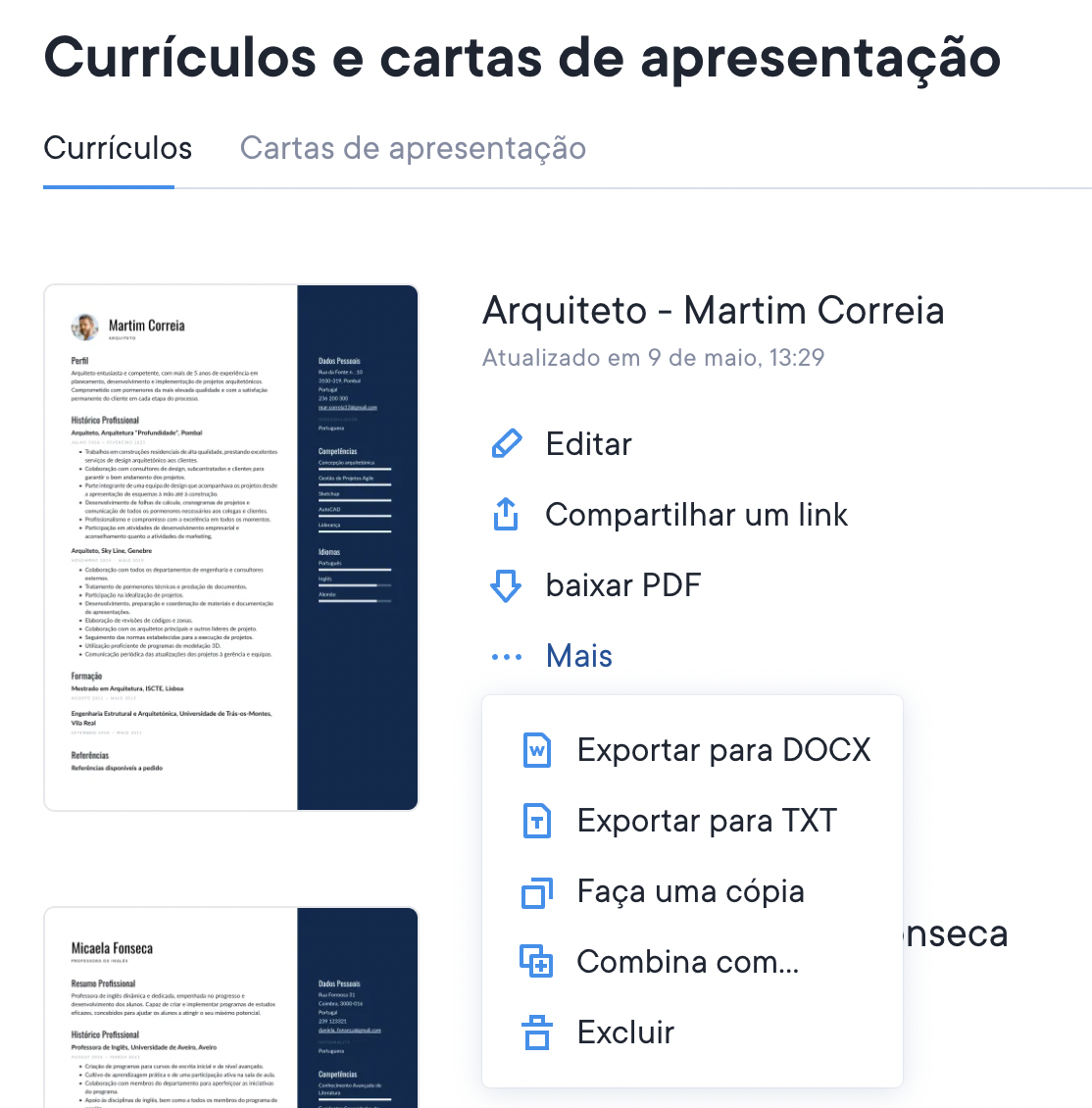 Tem sempre 3 opções para descarregar o seu currículo: ou como um ficheiro TXT (gratuito), em PDF ou em ficheiro DOCX. O seu currículo será o mesmo independentemente da opção de transferência que escolher, com exceção do ficheiro TXT.
