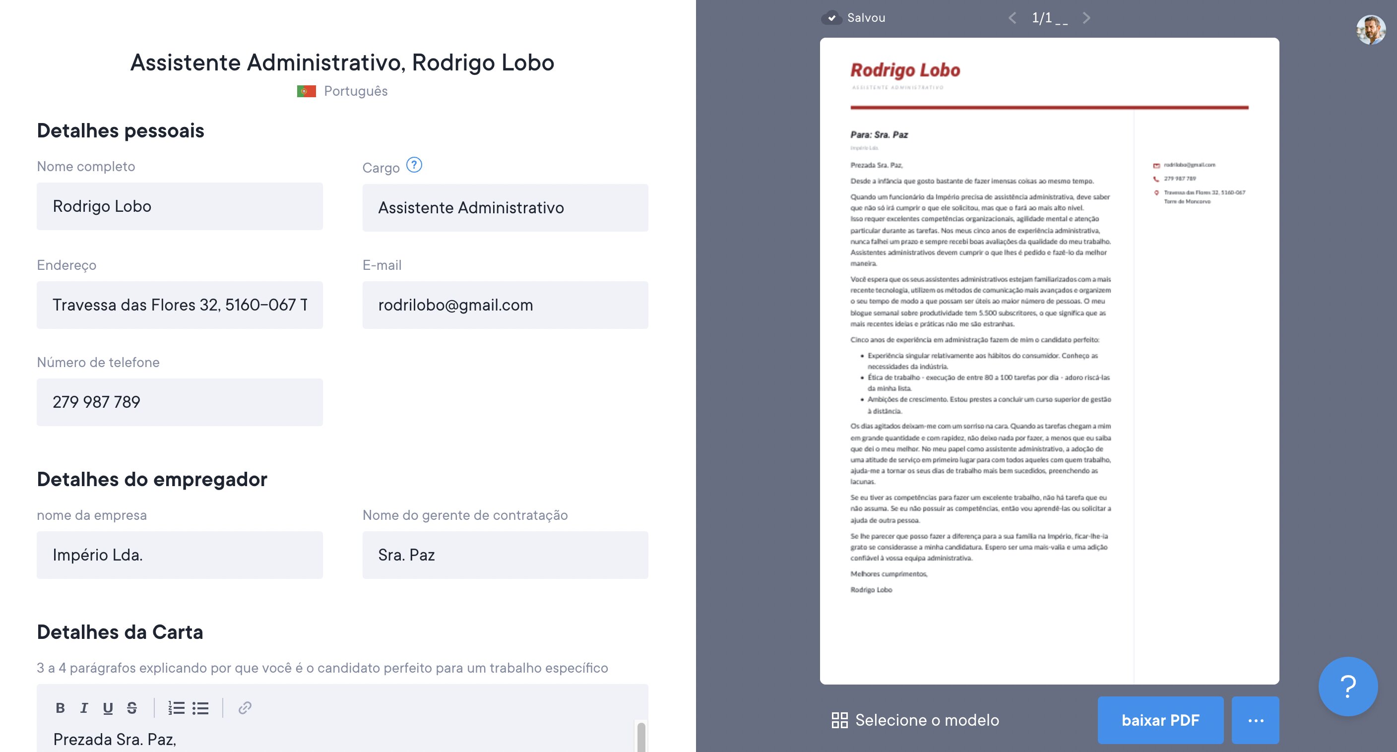 Poderá usar o Onlinecurriculo para criar, descarregar e partilhar cartas de apresentação gratuitamente. Cada modelo de currículo tem um modelo correspondente de carta de apresentação, que pode usar para enviar juntamente com o seu currículo. Terá acesso a modelos ilimitados de cartas de apresentação, escolha de cores personalizadas, bem como a opção de descarregar PDFs. Pode até combinar o seu currículo e carta de apresentação num único documento, tornando a experiência de recrutamento mais conveniente para todos. Poderá encontrar este novo recurso no menu suspenso em “Mais”, à direita da pré-visualização do seu currículo/carta de apresentação. Depois, basta escolher quais os dois documentos que deseja combinar e está pronto! Veja a imagem abaixo.