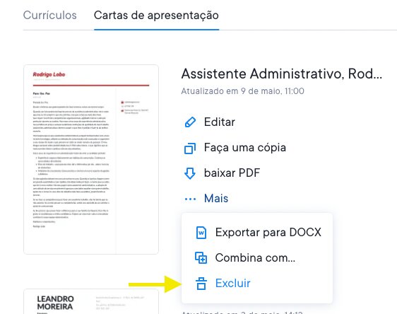 Apague uma carta de apresentação indo ao seu painel de cartas de apresentação e clicando em Eliminar. A eliminação de uma carta de apresentação é permanente. As cartas de apresentação apagadas não podem ser recuperadas pela nossa equipa. Veja a imagem abaixo.