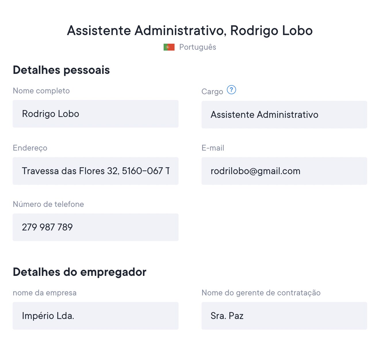 A Seção de Detalhes Pessoais é onde você adiciona seus dados pessoais, incluindo o título do cargo. Nós ajudamos você a começar, adicionando alguns detalhes do seu currículo.