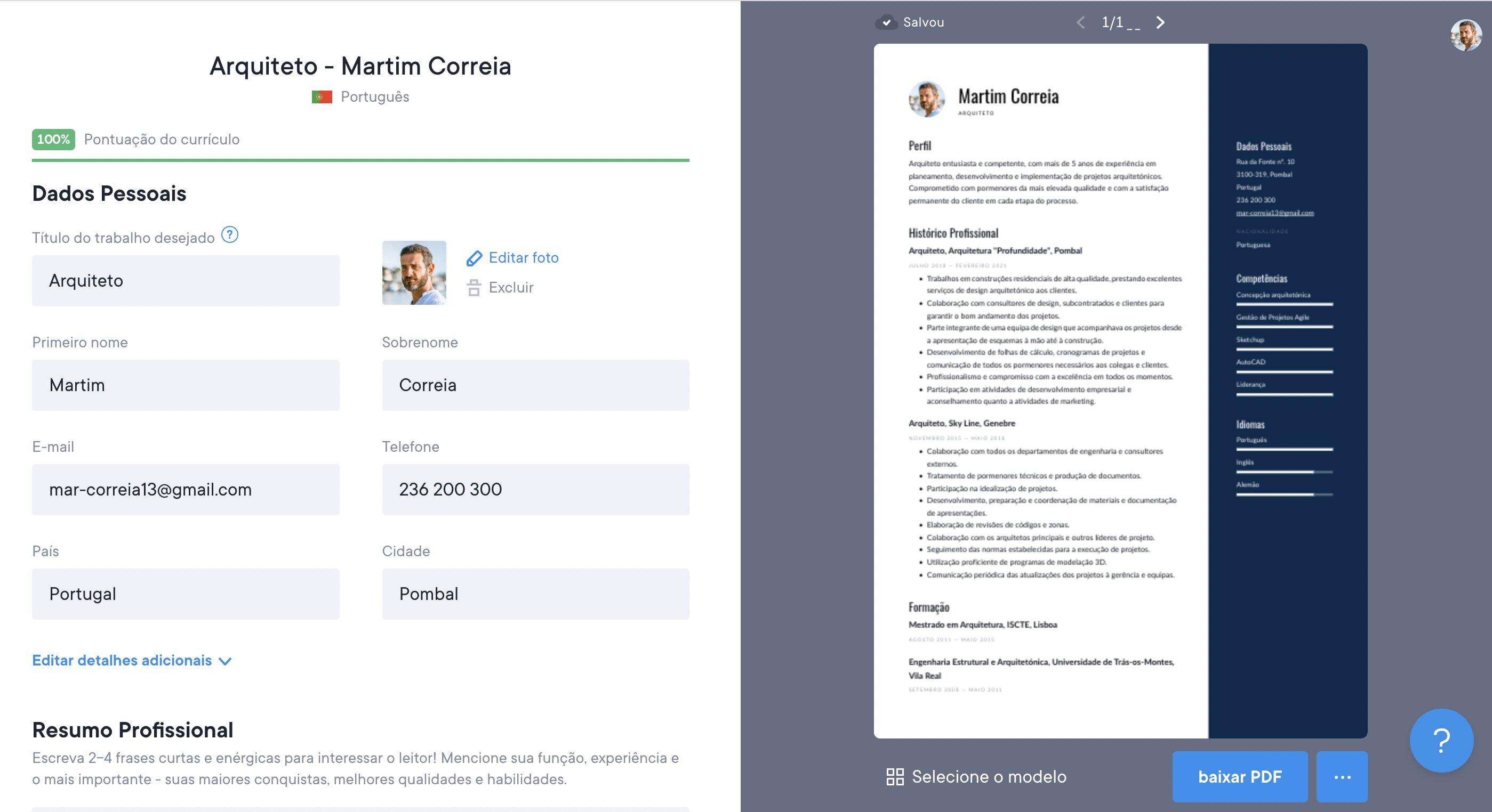 Quando começar a adicionar conteúdo ao seu currículo e carta de apresentação, poderá pré-visualizar o seu documento no modelo a qualquer altura, na página de pré-visualização. As suas edições aparecem na pré-visualização em tempo real.
